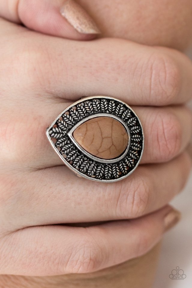 Chiseled into a tranquil teardrop, an earthy brown stone is pressed into a silver frame radiating with leafy foliage. Features a stretchy band for a flexible fit.