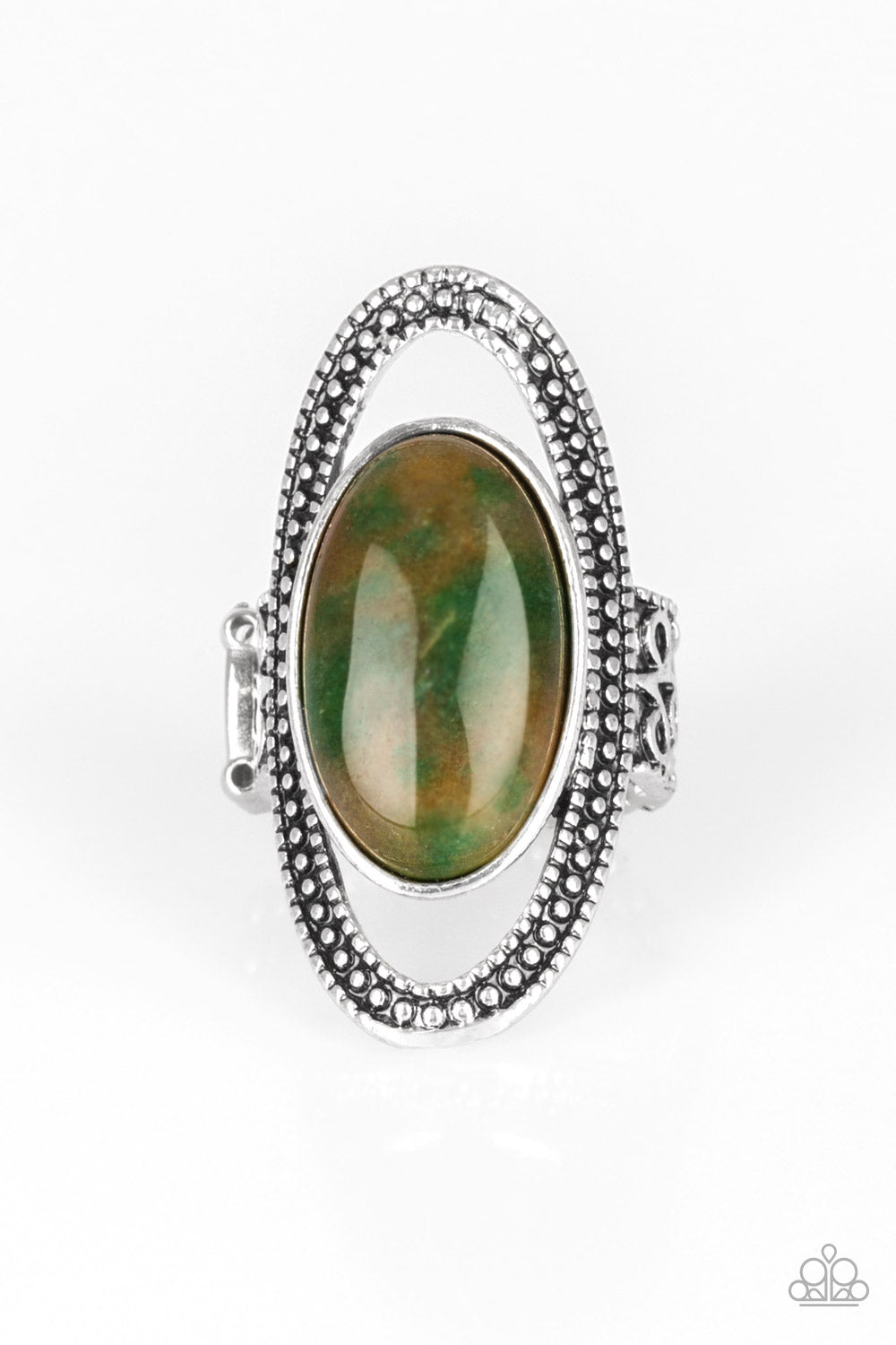 A studded silver frame encircles an earthy stone center, creating a dramatic Southwestern inspired look atop the finger. As the stone elements in this piece are natural, some color variation is normal. Features a stretchy band for a flexible fit.