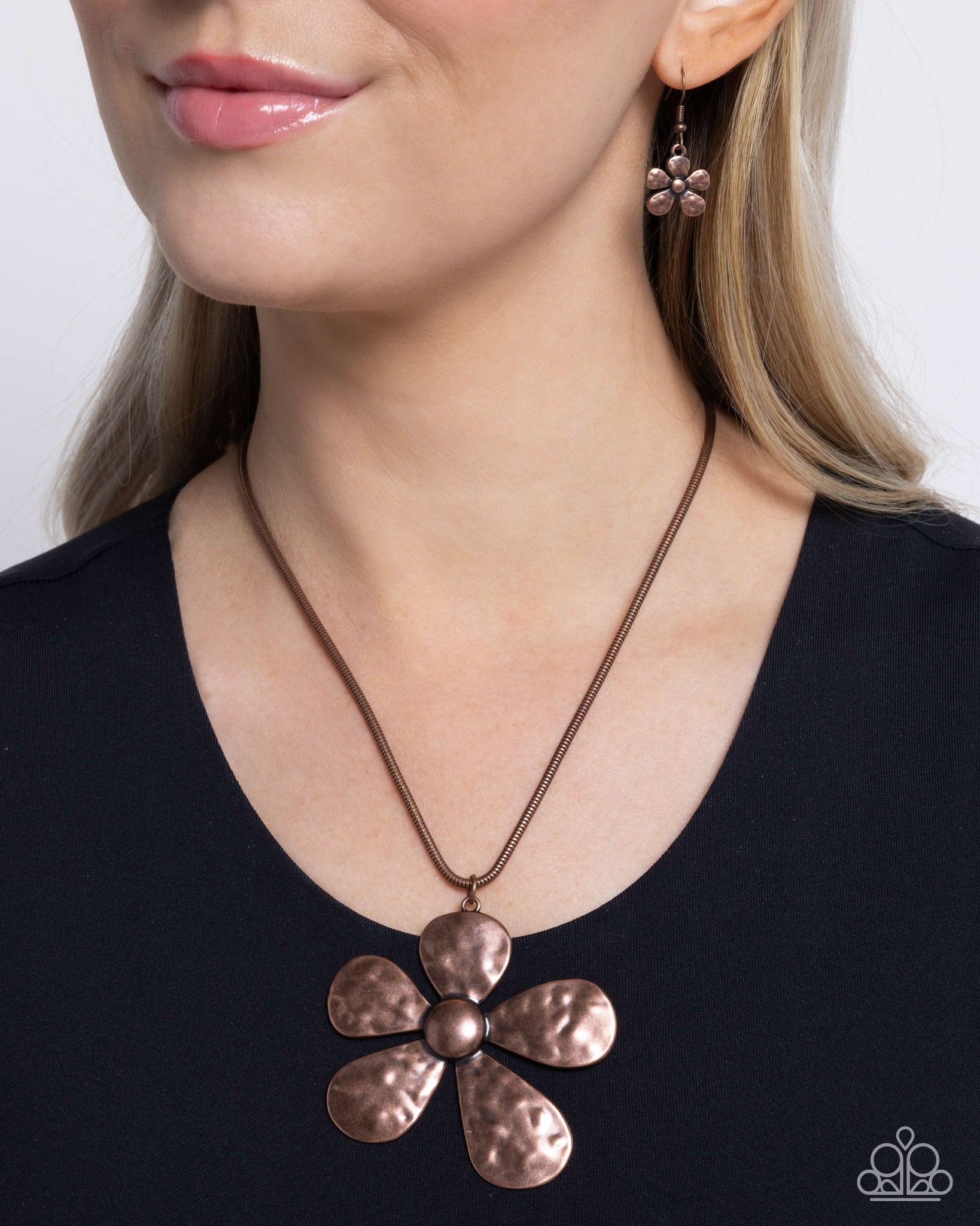 Gliding along a copper rounded snake chain, an abstract, hammered copper flattened flower pendant sways below the neckline for a botanically, boisterous display. Features an adjustable clasp closure.