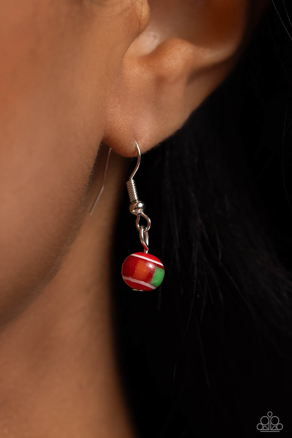 A strand of flat silver curb chain collides with a classic chain and a vivacious collection of red beads, featuring various multicolored splatters across its surface, to create an abstract blend of color and class. The mismatched chains connect to a large silver hoop with a red-striped silver heart dangling at the bottom of the display, infusing the design with additional charm. Features an adjustable clasp closure.