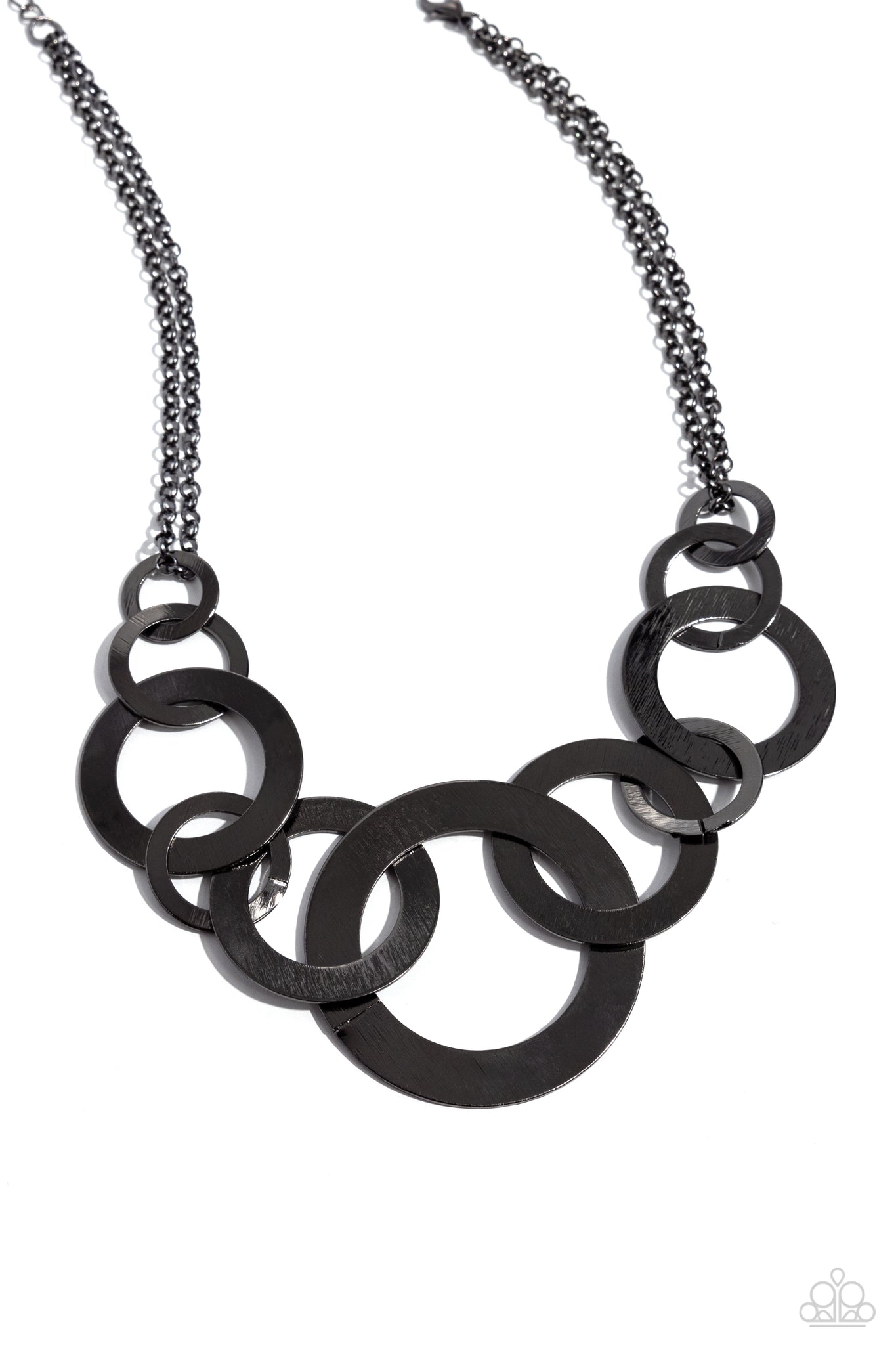 A shiny collection of flat gunmetal rings in varying sizes and brushed in a brilliant gunmetal shimmer, link together below the collar. The assortment of gunmetal rings attaches to a bright gunmetal chain for a dazzling finish. Features an adjustable clasp closure.