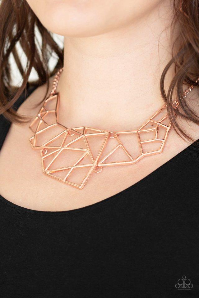 Shattered silver plates link below the collar, coalescing into an edgy geometric pendant. Features an adjustable clasp closure.