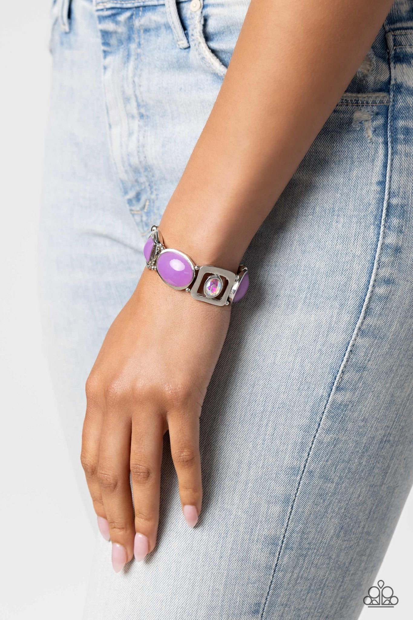 Featuring purple acrylic beads, a mismatched collection of asymmetrical silver circle, square, and teardrop frames link around the wrist on an elastic stretchy band. Silver beads in various sizes separate each shape, while accents of white glitz and iridescent beads unite into a glitzy mashup around the wrist. Due to its prismatic palette, color may vary.