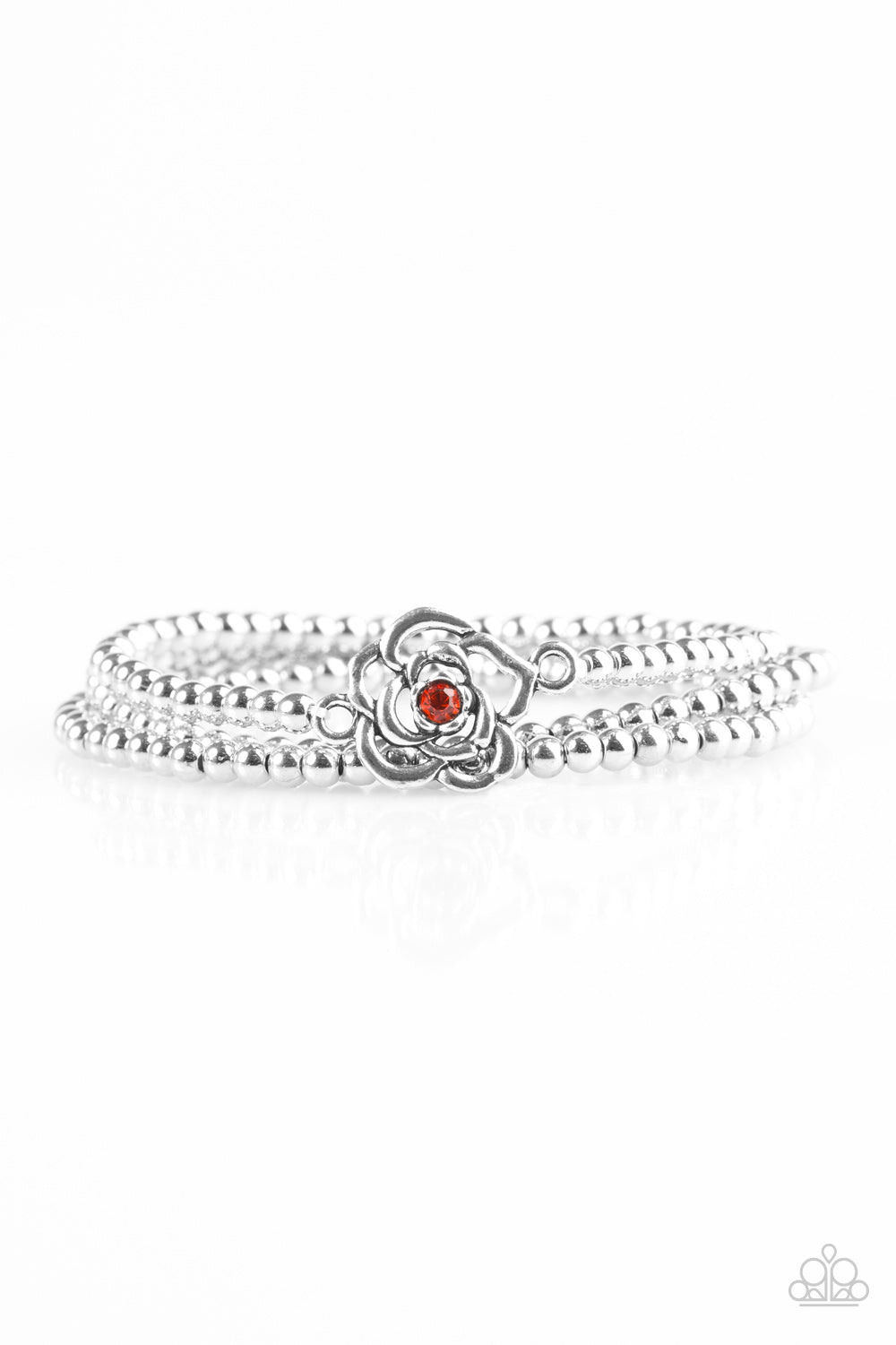 Dainty silver beads are threaded along elastic stretchy bands. Dotted with a glittery orange rhinestone center, a shimmery silver floral charm adorns one strand, creating a whimsical centerpiece atop the wrist.