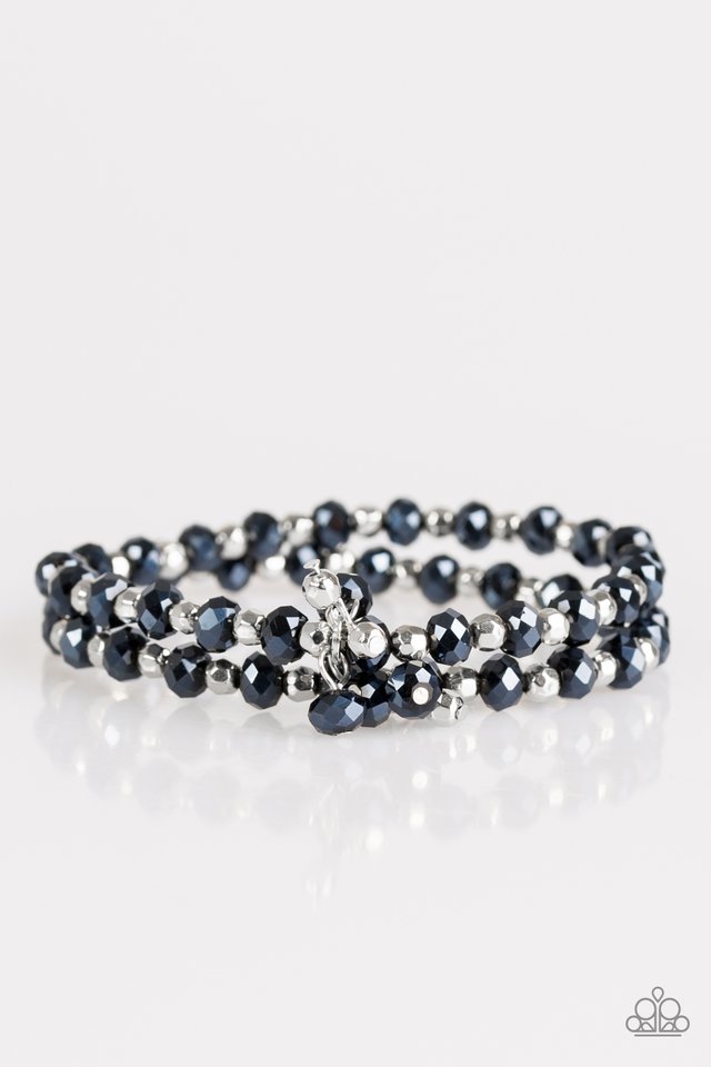 Brushed in a metallic sheen, glittery beads and faceted silver beads are threaded along stretchy elastic bands. Matching beads swing from the wrist, creating clustered centerpieces.
