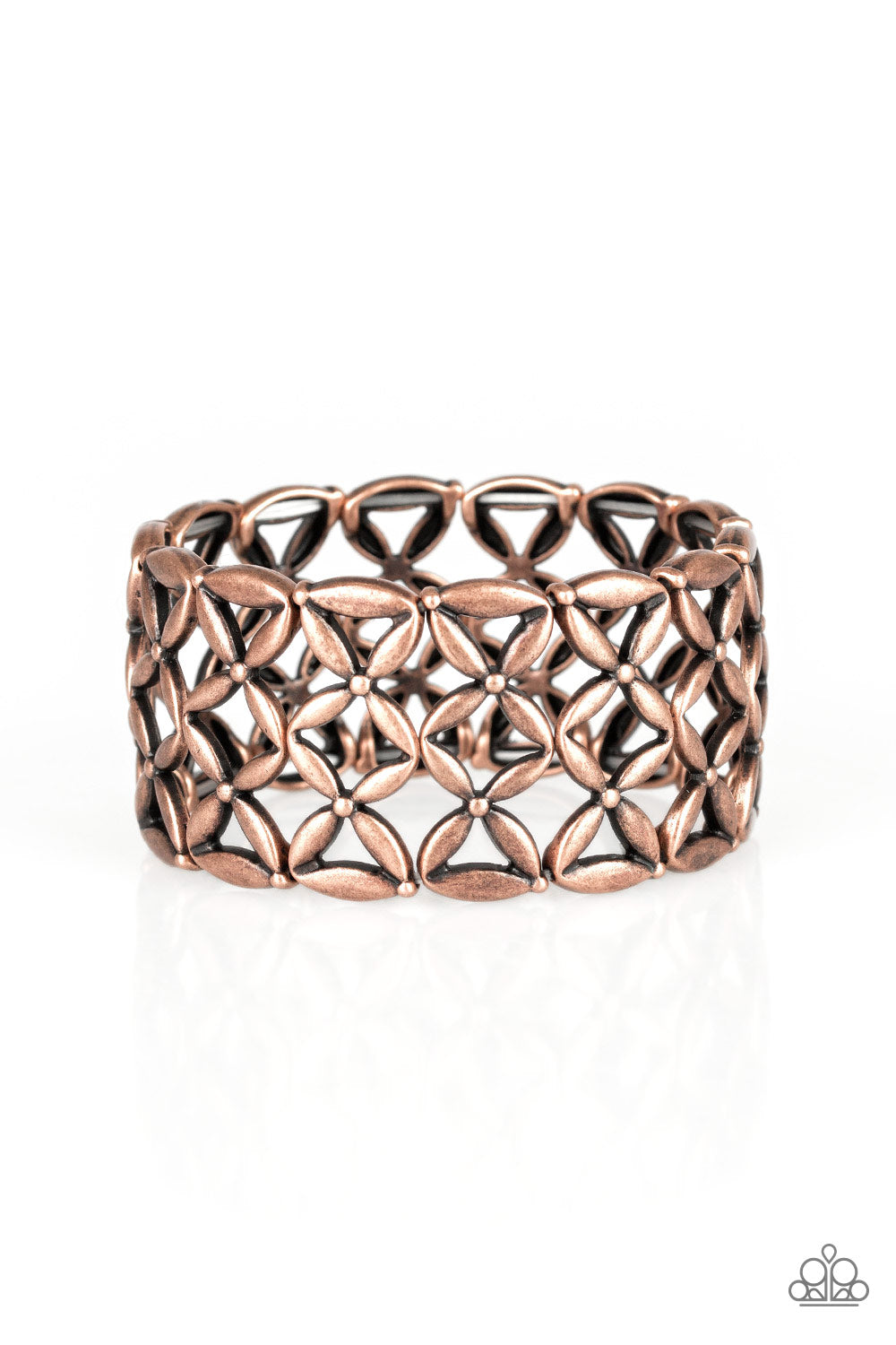 Shimmery copper floral frames are threaded along a stretchy band, stacking into a bold seasonal look.
