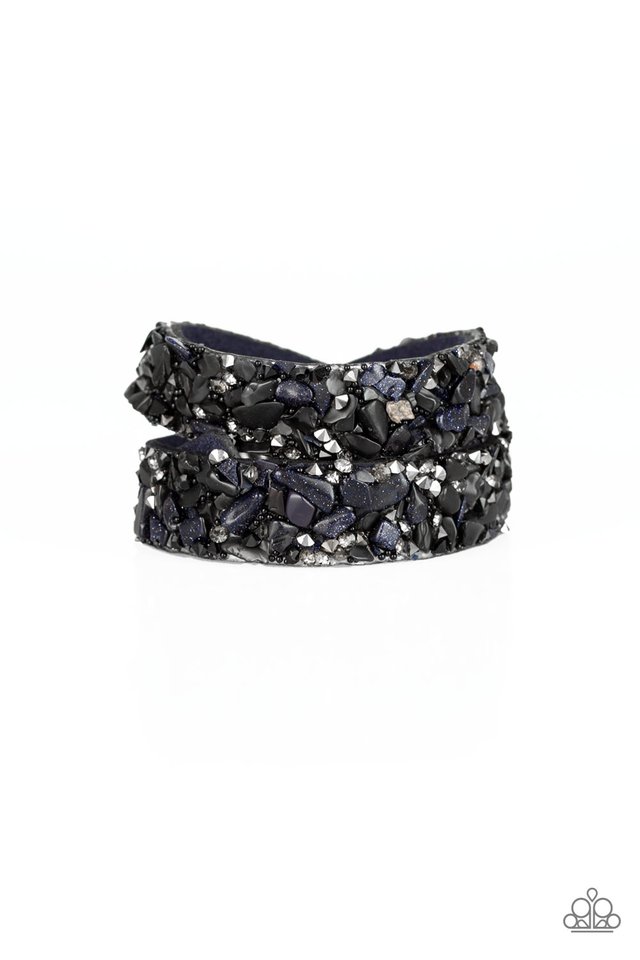 A collection of crushed rocks, smoky and hematite rhinestone prisms are sprinkled across a blue or brown suede band for a seasonal look. The elongated band allows for a trendy double wrap design. Features an adjustable snap closure.