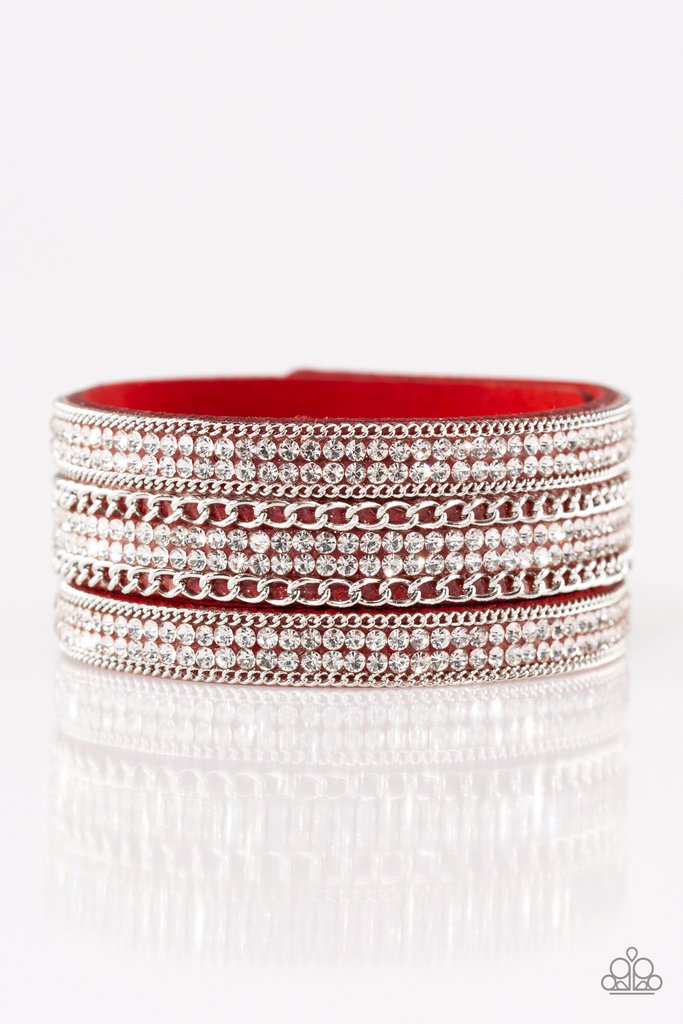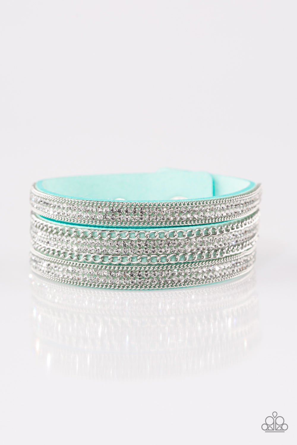 Rows of shimmery silver chains and glassy white rhinestones are encrusted along a white, blue, purple or red suede band. The glittery band has been spliced into three strands, creating row after row of blinding shimmer for a sassy look. Features an adjustable snap closure.
