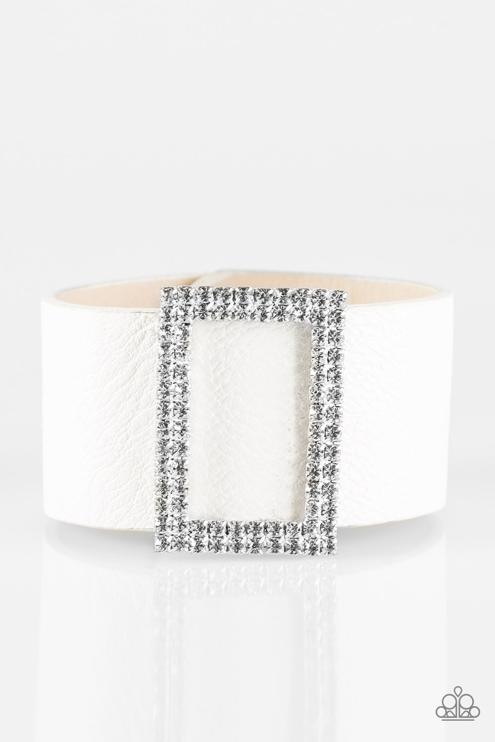Two rows of dazzling white rhinestones coalesce into a rectangular frame. The glittery frame is threaded along a band of white leather, creating a stunning centerpiece. Features an adjustable snap closure.