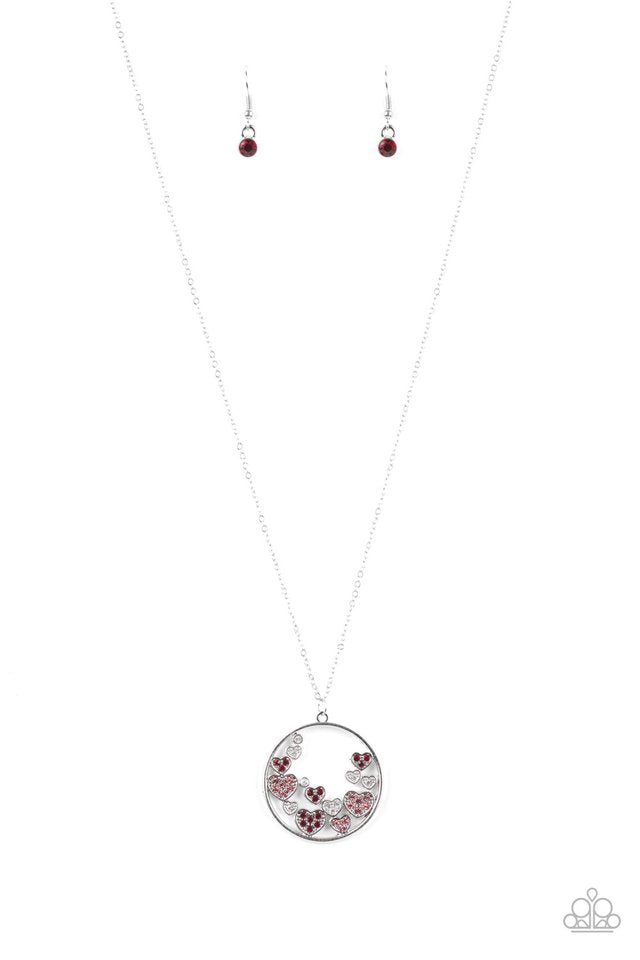Pink, red, and white rhinestones are sprinkled across a round silver pendant radiating with dainty silver hearts for a romantic finish. Features an adjustable clasp closure.