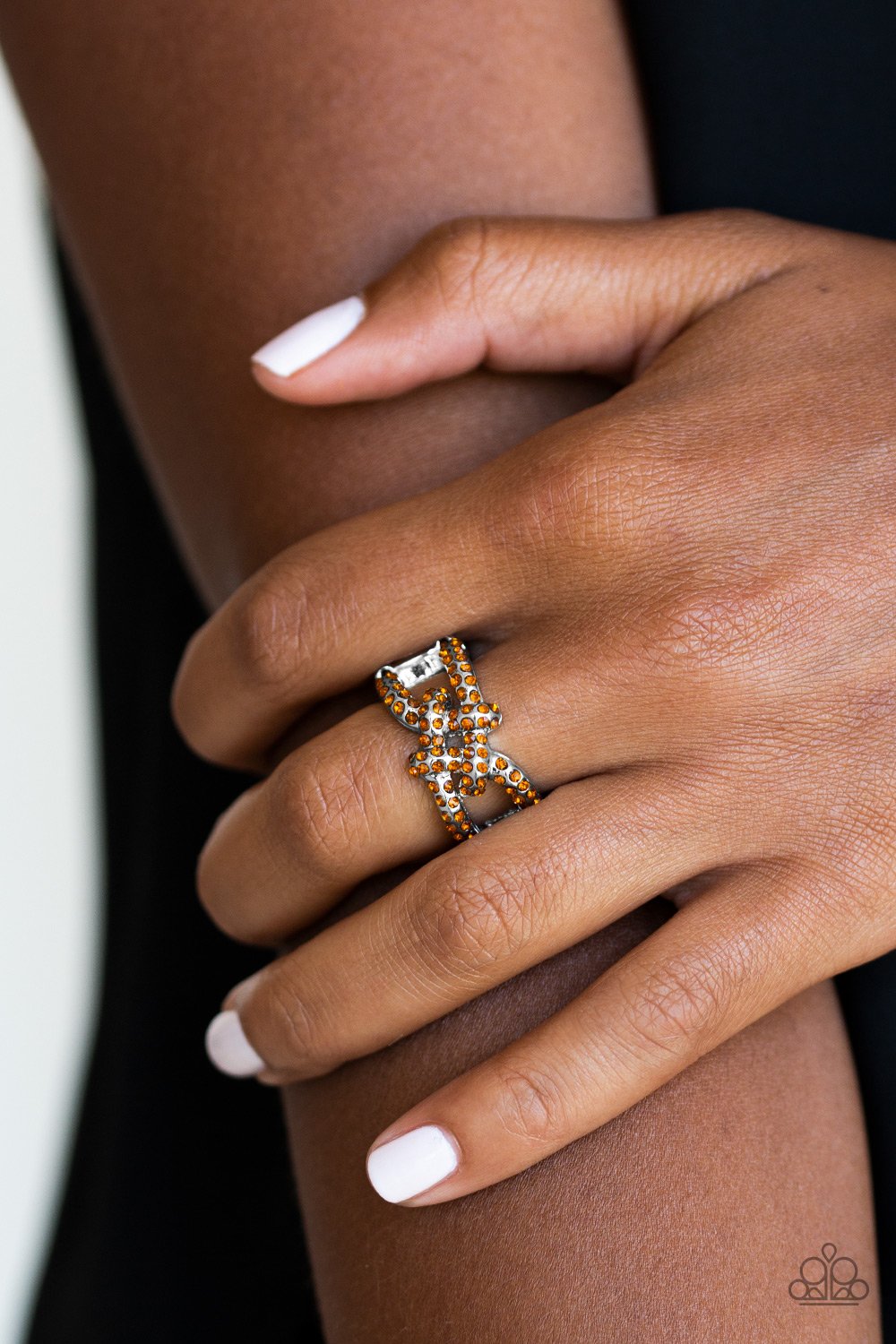 Encrusted in glittery rhinestones, shimmery silver bars crisscross across the finger, coalescing into a bold square knot atop the finger. Features a stretchy band for a flexible fit.