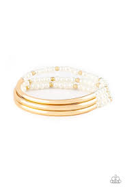 Shiny gold bars and pearly white beads are threaded along stretchy elastic bands, creating refined layers across the wrist.