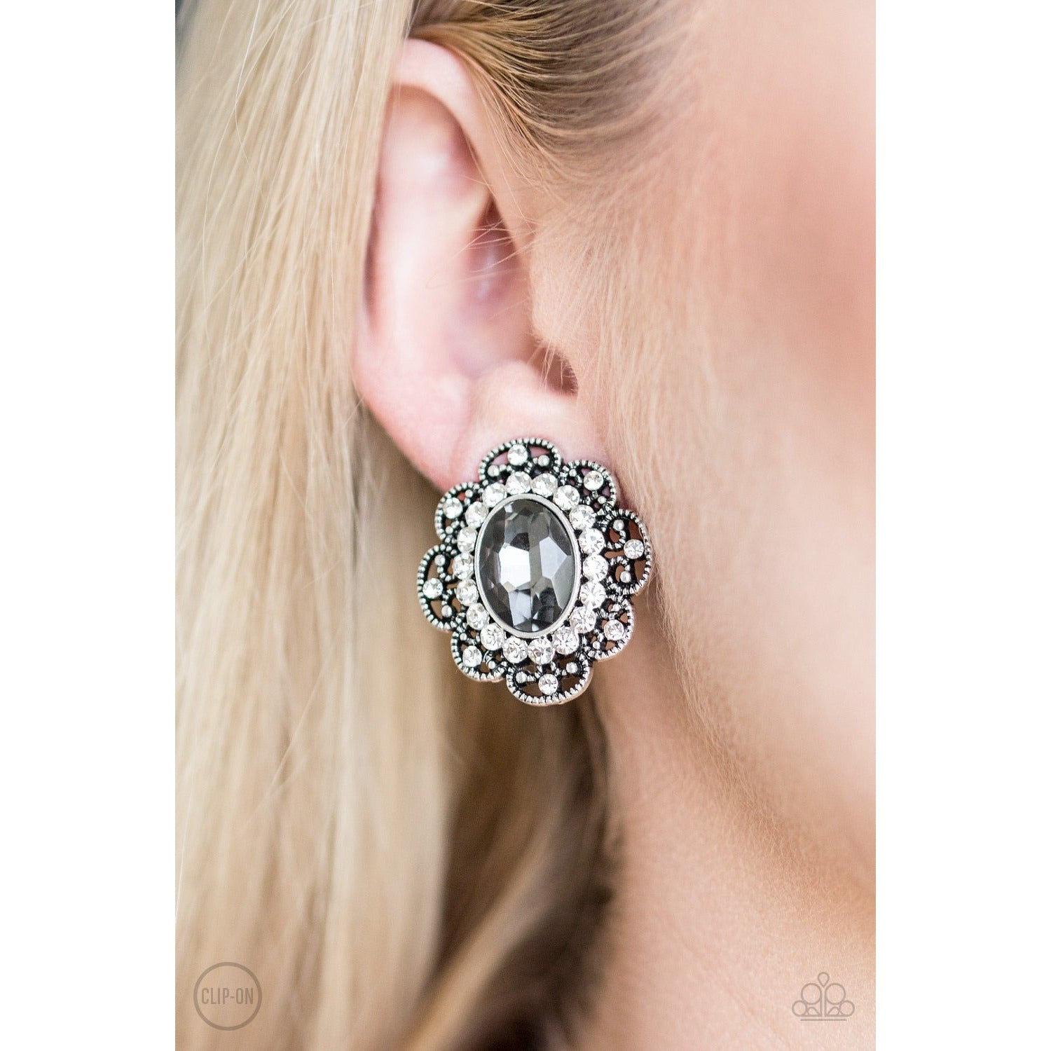 Dotted silver filigree spins into a frilly frame. A ring of radiant white rhinestones spins around a dramatic smoky gem center for a glamorous look. Earring attaches to a standard clip-on fitting.