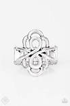 Glistening silver filigree loops across the finger for a whimsical look. Features a stretchy band for a flexible fit.