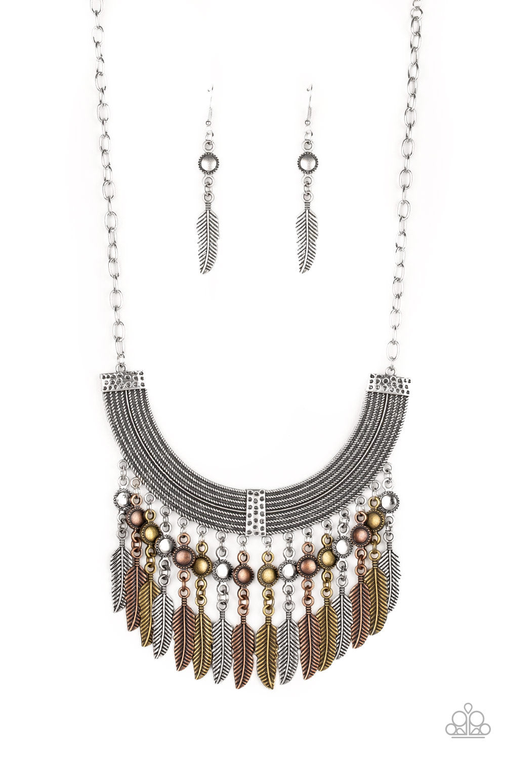 Shimmery silver, copper, and brass feather charms dangle from the bottom of a bowing silver frame, creating a ferocious fringe below the collar. Features an adjustable clasp closure.