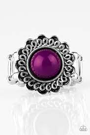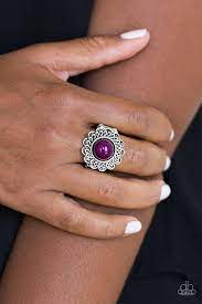 A vivacious purple bead is pressed into the center of a shimmery floral frame radiating with swirling detail. Features a stretchy band for a flexible fit.