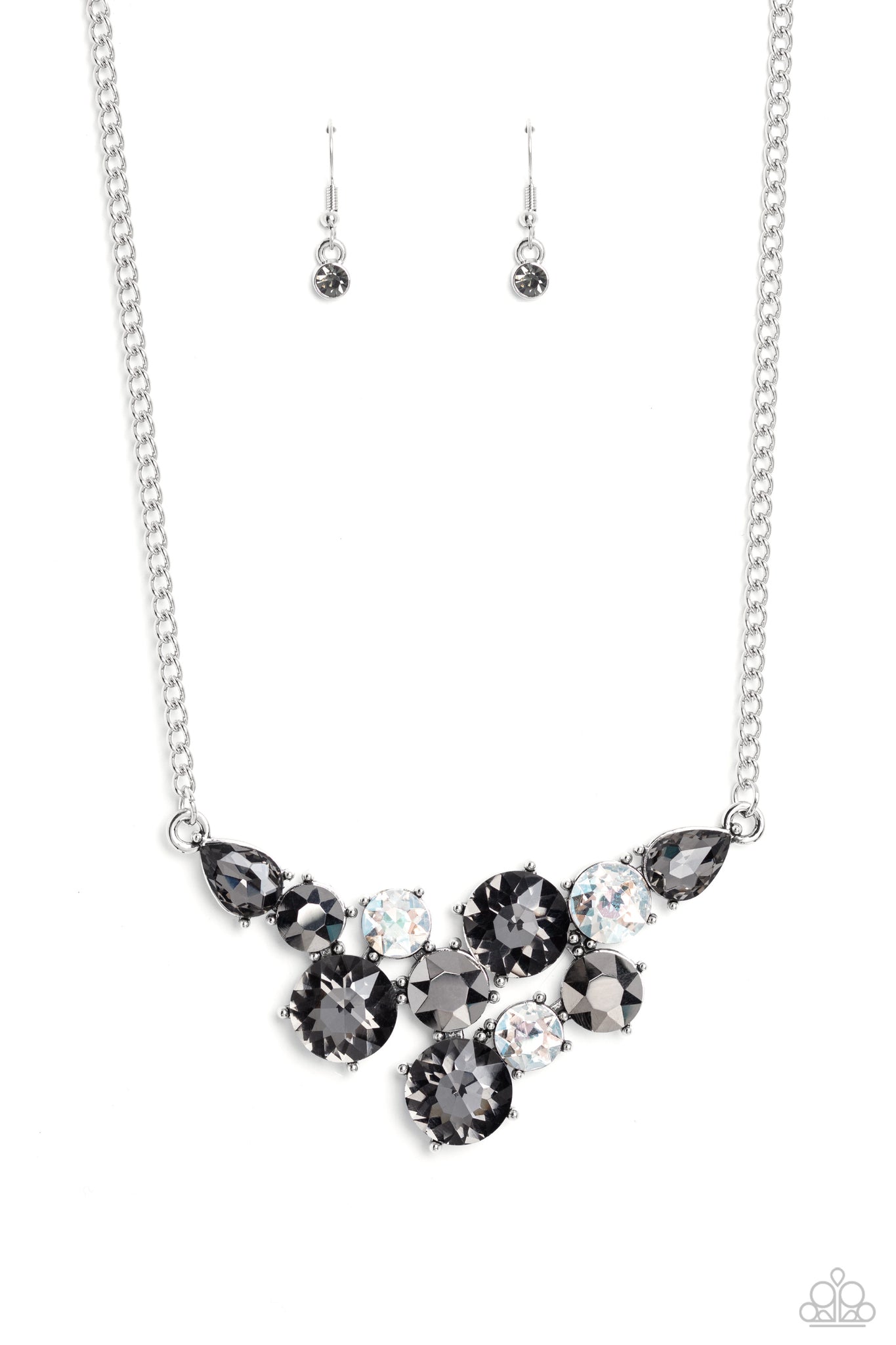 An explosion of round gems in varying sizes bordered by teardrop gems cluster together to create a glittery silver fringe down the neckline. Featured in white, smoky, and hematite hues, each gem reflects light off of its faceted surface emitting further glitz and glam. Features an adjustable clasp closure.